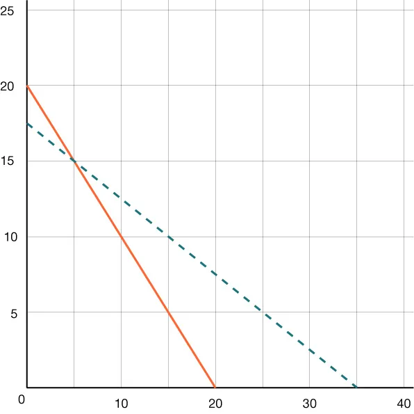 A family buys a total of 32 tickets at a carnival. Ride tickets cost $1.50 each and food tickets cost $3.25 each. The family pays a total of $90 for the tickets. The situation is graphed below.