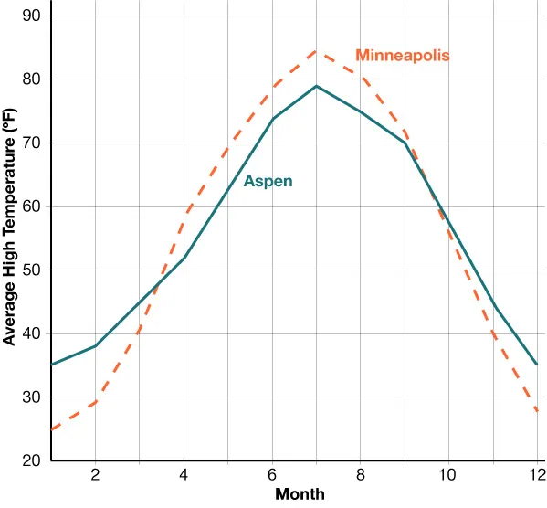- is the average high temperature in Aspen, Colorado, months after the start of the year. is the average high temperature in Minneapolis, Minnesota, months after the start of the year. Temperature is measured in degrees Fahrenheit.