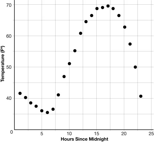 The temperature was recorded at several times during the day. Function gives the temperature in degrees Fahrenheit, hours since midnight. A graph for this function is provided.