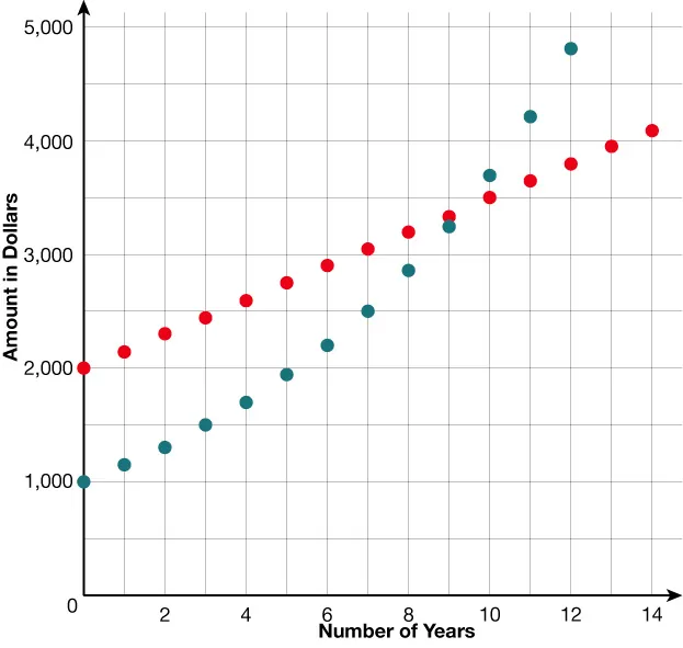 The blue data on the graph containing is Purse , and the red data on the graph containing is Purse . Purse starts with less money than Purse , so its graph will be lower at the beginning.The blue data on the graph containing is Purse , and the red data on the graph containing is Purse . Purse starts with less money than Purse , so its graph will be lower at the beginning.