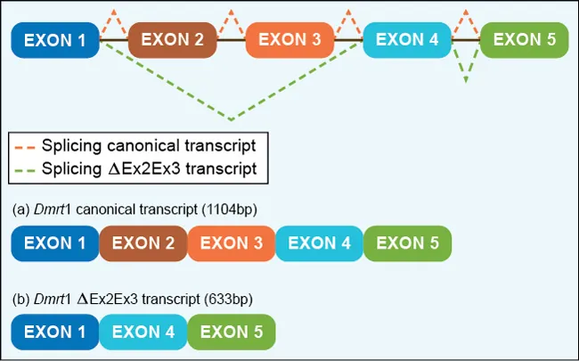 A research study showed a gene was alternatively spliced in two ways during embryonic development of the turtle based on environmental temperature. The image shows the two transcript variants.