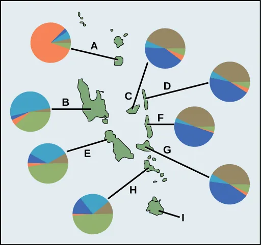 Island I is colonized by a group of birds from the nearest island. Make a prediction about the genetic markers of the population that would form in island I.