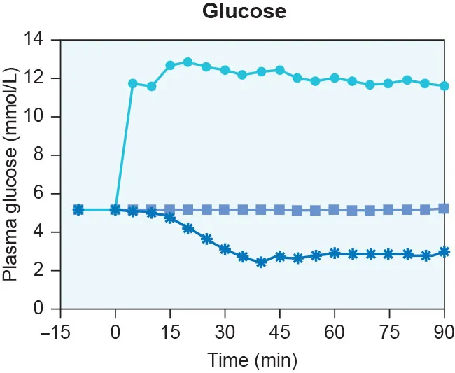 In the graph, light blue line shows high amounts of glucose in blood, the middle blue lines shows normal amounts and the dark blue line shows low amounts of glucose in blood.