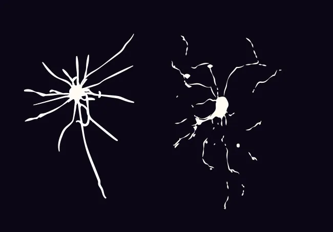 This image shows two neurons. The neuron on the left is healthy. The neuron on the right is damaged and has retracted its arms.