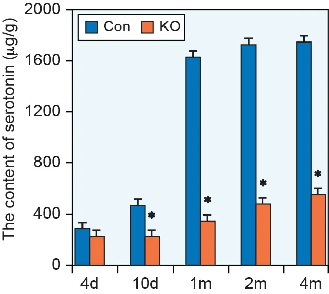 The graph shows serotonin levels on two groups of mice. The "KO" group mice have depression (artificially induced for the study) and the "Con" group is the control group.