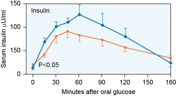 Prediabetic people start producing insulin later than normal people and produce less of it.