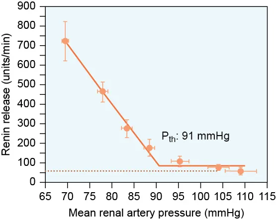 Renin is a hormone secreted by kidneys and is important in controlling blood volume. The graph shows renin secretion against the blood pressure.