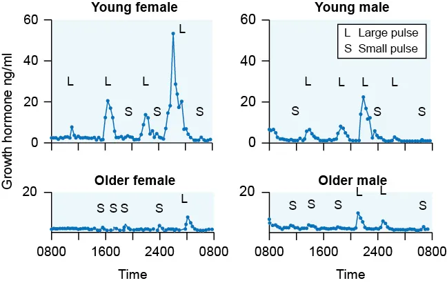 The graph shows the concentration of growth hormone (GH) in younger and older people of both genders.