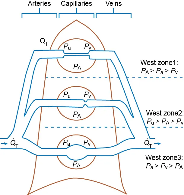 The image shows the pressures in different areas of the lung for a person that is standing upright.