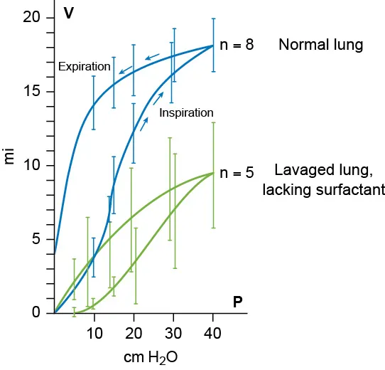 The graphs show the pressure and volume changes in normal rabbits, and rabbits whose lung surfactant was removed.