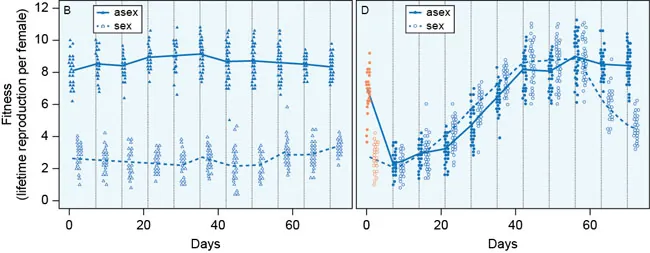The left graph shows the fitness of the sexually-reproduced offspring. The right graph shows the fitness of the asexually-reproduced offspring.