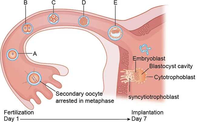 The image shows early embryonic development in humans in days 1 - 7 after fertilization.