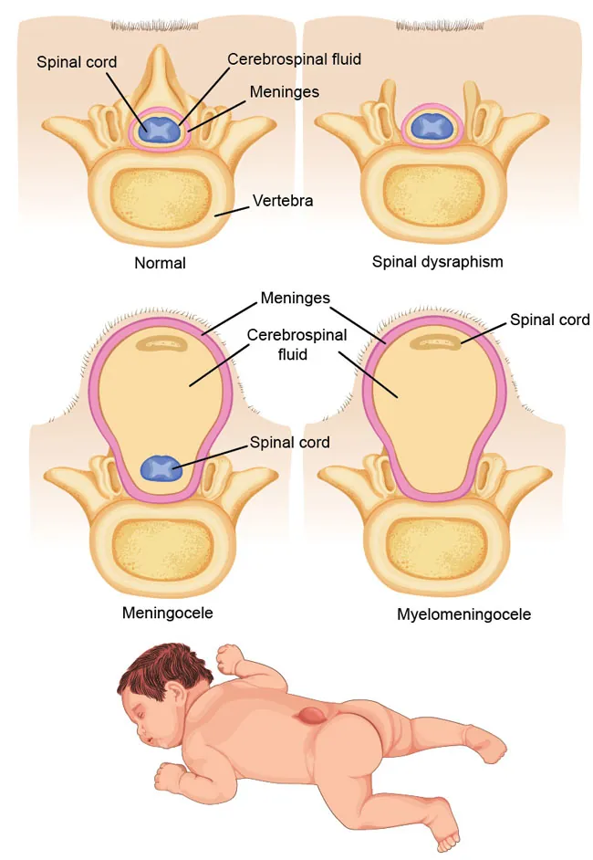 The image shows a condition called spina bifida. This condition occurs when the neural tube does not close properly at the lower end of the body at the spine. The bottom right condition, called meningomyelocele, is the most severe version of spina bifida. It causes severe impairment, while other versions of the condition may not cause severe impairment.