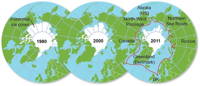 A number of global events have occurred that may be attributed to climate change during our lifetimes. Glacier National Park in Montana is undergoing the retreat of many of its glaciers, a phenomenon known as glacier recession. In 1850, the area contained approximately 150 glaciers. By 2010, however, the park contained only about 24 glaciers greater than 25 acres in size. One of these glaciers is the Grinnell Glacier (Figure 35.30) at Mount Gould. Between 1966 and 2005, the size of Grinnell Glacier shrank by 40 percent. Similarly, the mass of the ice sheets in Greenland and the Antarctic is decreasing: Greenland lost 150–250 km3 of ice per year between 2002 and 2006. In addition, the size and thickness of the Arctic sea ice is decreasing.