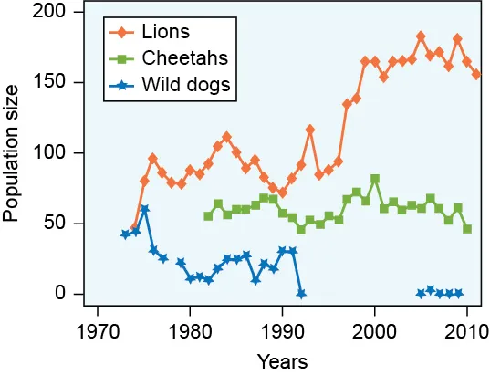 The graph shows lion, cheetah and wild dog populations in the Serengeti, a geographical area in Africa. These predators often hunt the same prey and are in competition with each other.