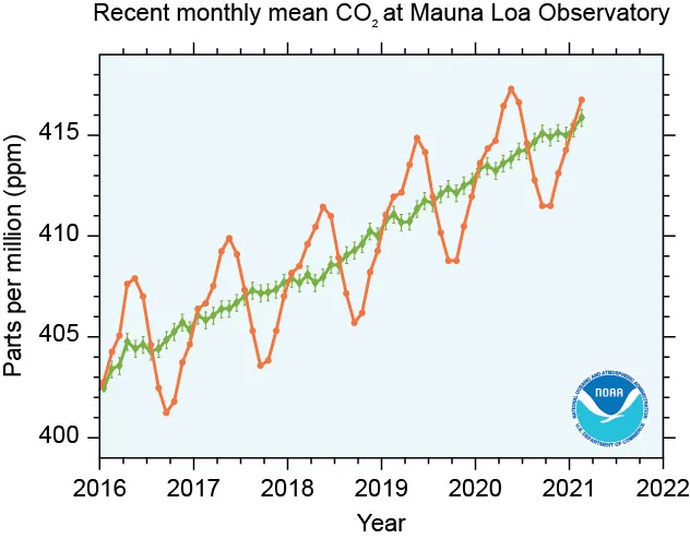 The red line on the graph shows the monthly carbon dioxide measurements between 2016 and 2021. Each dot represents a month. The year's first dot is January.