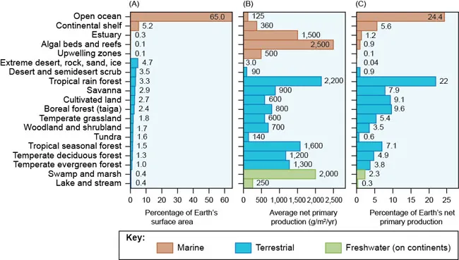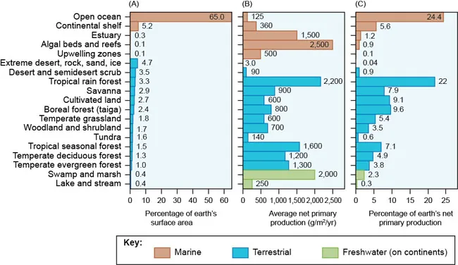 Open oceans do not account for most of the net primary production on Earth.