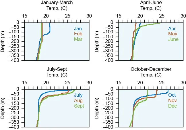 Temperature below 200 m varies very little during the year.