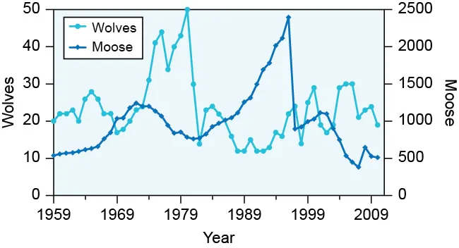 The graph shows the wolf and moose populations in Isle Royale, a protected national park in Michigan. Wolves are the main predator of moose, but there are many other factors at play.