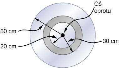 Urządzenie składa się z tarczy o masie 2,0 kg i promieniu 50 cm, na której zamocowany jest pierścień o masie 1,0 kg oraz promieniu wewnętrznym 20 cm i zewnętrznym 30 cm (patrz poniżej). Urządzenie obraca się wokół osi przechodzącej przez środek tarczy i pierścienia, a prędkość kątowa wynosi 10 obr/s.
