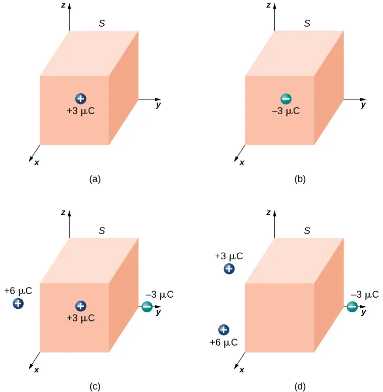 To równanie obowiązuje dla ładunków dowolnego znaku, ponieważ zdefiniowaliśmy wektor powierzchni jako skierowany na zewnątrz powierzchni zamkniętej. Jeżeli otoczony ładunek jest ujemny, zobacz Ilustracja 6.16 (b), wtedy strumień zarówno przez , jak i jest ujemny.