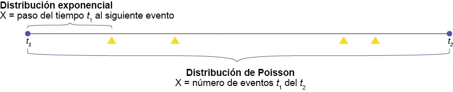 Existe una relación interesante entre la distribución exponencial y la distribución de Poisson. Supongamos que el tiempo que transcurre entre dos eventos sucesivos sigue la distribución exponencial con una media de μ unidades de tiempo. También se supone que estos tiempos son independientes, lo que significa que el tiempo entre eventos no se ve afectado por los tiempos entre eventos anteriores. Si se cumplen estos supuestos, el número de eventos por unidad de tiempo sigue una distribución de Poisson con una media μ. Recordemos que si X tiene la distribución de Poisson con una media μ, entonces .