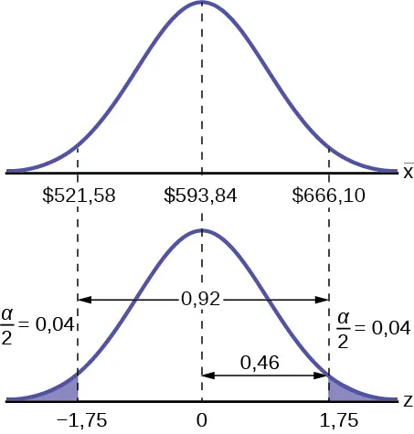 Comenzamos con el intervalo de confianza para una media. Utilizamos la fórmula de la media porque la variable aleatoria son los dólares gastados y esta es una variable aleatoria continua. La estimación puntual de la desviación típica de la población, s, se ha sustituido por la verdadera desviación típica de la población porque con 80 observaciones no hay preocupación por el sesgo en la estimación del intervalo de confianza.