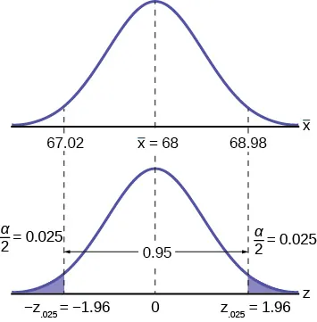 Suppose we are interested in the mean scores on an exam. A random sample of 36 scores is taken and gives a sample mean (sample mean score) of 68 ( = 68). In this example we have the unusual knowledge that the population standard deviation is 3 points. Do not count on knowing the population parameters outside of textbook examples. Find a confidence interval estimate for the population mean exam score (the mean score on all exams).