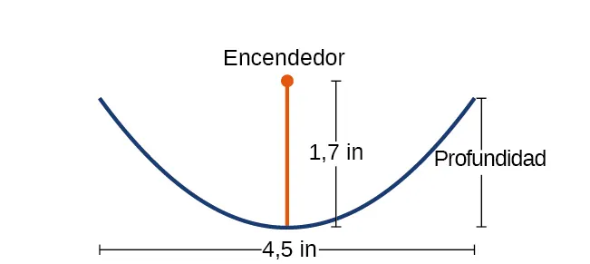 - Ⓐ Halle la ecuación de la parábola que modela el encendedor. Supongamos que el vértice del espejo parabólico es el origen del plano de coordenadas.