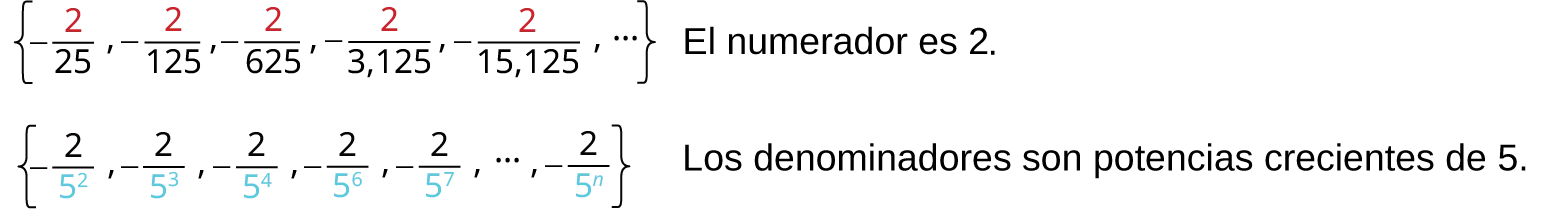 Hasta ahora, se nos ha dado la fórmula explícita y se nos ha pedido que calculemos un número de términos de la secuencia. A veces, la fórmula explícita del término de una secuencia no se da. En cambio, se nos dan varios términos de la secuencia. Cuando esto ocurre, podemos trabajar a la inversa para hallar una fórmula explícita a partir de los primeros términos de una secuencia. La clave para hallar una fórmula explícita es buscar un patrón en los términos. Tenga en cuenta que el patrón puede involucrar términos alternos, fórmulas para numeradores, fórmulas para denominadores, exponentes o bases.