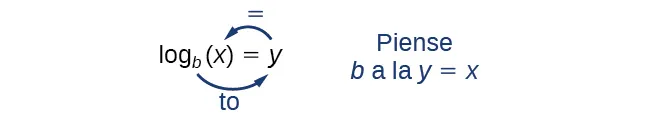 Leemos una expresión logarítmica como: "El logaritmo con base de es igual a o, simplificado, la "base logarítmica de es «”. También podemos enunciar: " elevado a la potencia de es porque los logaritmos son exponentes. Por ejemplo, el logaritmo de base 2 de 32 es 5, porque 5 es el exponente que debemos aplicar a 2 para obtener 32. Dado que podemos escribir Lo leemos como “la base logarítmica 2 de 32 es 5".