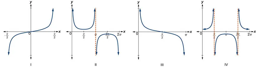 Podemos ver que, a medida que se acerca a las salidas son cada vez menores. Recuerde que hay algunos valores de para los cuales Por ejemplo, y En estos valores, la función tangente es indefinida, por lo que el gráfico de tiene discontinuidades en En estos valores, el gráfico de la tangente tiene asíntotas verticales. La Figura 1 representa el gráfico de La tangente es positiva desde 0 hasta y de con correspondientes a los cuadrantes I y III del círculo unitario.