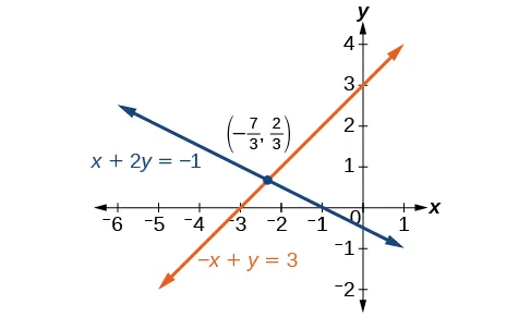 La representación gráfica de los sistemas de ecuaciones nos ofrece una perspectiva importante. Vea la Figura 5 para calcular que las ecuaciones se intersecan en la solución. No necesitamos preguntarnos si puede haber una segunda solución porque la observación del gráfico confirma que el sistema tiene exactamente una solución.