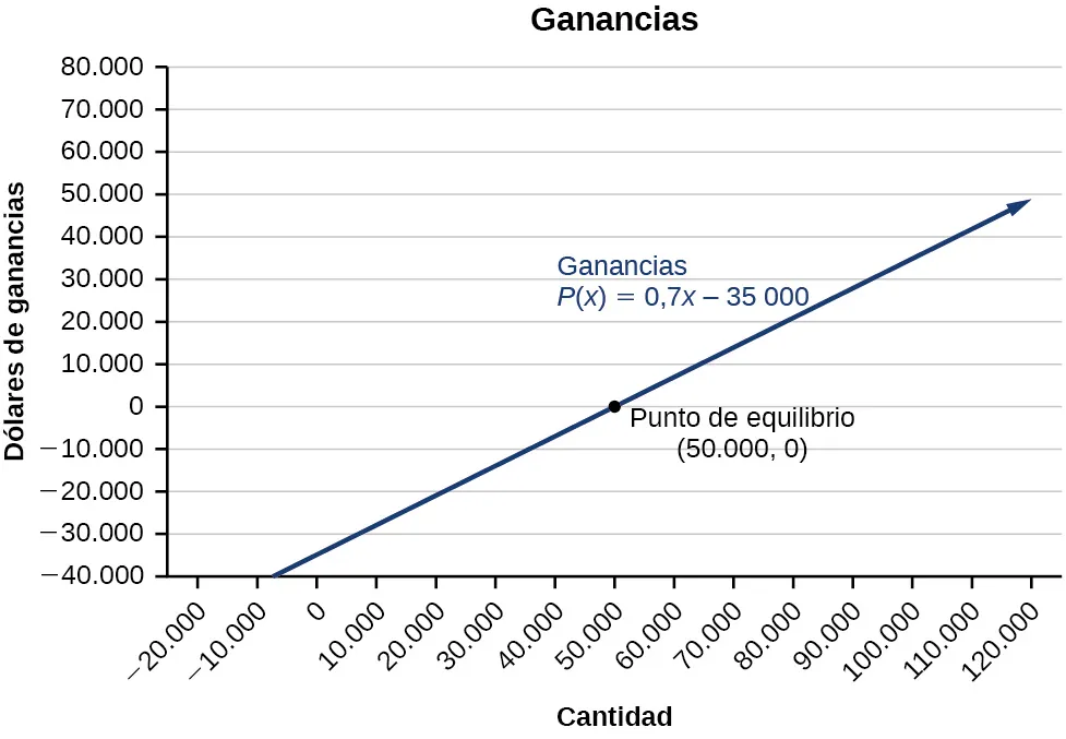 La región sombreada a la derecha del punto de equilibrio representa las cantidades por las cuales la compañía obtiene ganancias. La región sombreada de la izquierda representa las cantidades por las que la empresa sufre pérdidas. La función de ganancias es la función de ingresos menos la función de costo, escrita como Está claro que conocer la cantidad para la cual el costo es igual a los ingresos es de gran importancia para los negocios.