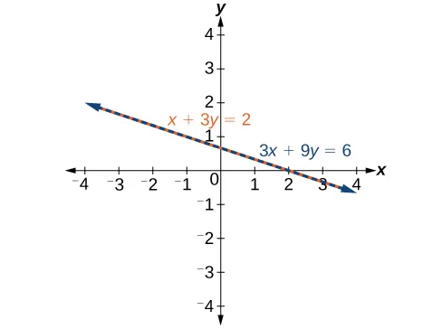 Además de considerar el número de ecuaciones y variables, clasificamos los sistemas de ecuaciones lineales por el número de soluciones. Un sistema consistente de ecuaciones tiene, al menos, una solución. Se considera que un sistema consistente es un sistema independiente si tiene una única solución, como el ejemplo que acabamos de explorar. Las dos líneas tienen pendientes diferentes y se intersecan en un punto del plano. Se considera que un sistema consistente es un sistema dependiente si las ecuaciones tienen la misma pendiente y las mismas intersecciones en y. En otras palabras, las líneas coinciden, por lo que las ecuaciones representan la misma línea. Cada punto de la línea representa un par de coordenadas que satisface el sistema. Por lo tanto, hay un número infinito de soluciones.