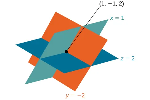 El conjunto de soluciones de un sistema de tres por tres es un triple ordenado Gráficamente, el triple ordenado define el punto que es la intersección de tres planos en el espacio. Puede visualizar dicha intersección imaginando cualquier esquina de una habitación rectangular. Una esquina está definida por tres planos: dos paredes contiguas y el piso (o el techo). Cualquier punto de encuentro entre dos paredes y el piso representa la intersección de tres planos.