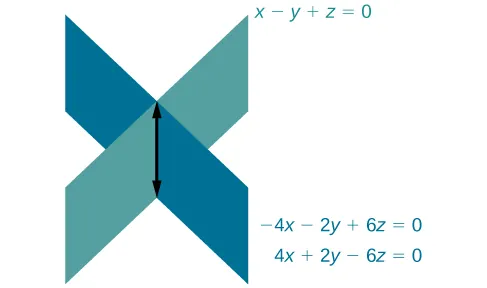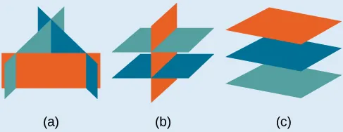 Sabemos por haber trabajado con sistemas de ecuaciones con dos variables que un sistema de ecuaciones dependiente tiene un número infinito de soluciones. Lo mismo ocurre con los sistemas dependientes de ecuaciones de tres variables. De varias situaciones puede resultar un número infinito de soluciones. Los tres planos pueden ser iguales, de modo que la solución de una ecuación será la solución de las otras dos ecuaciones. Las tres ecuaciones podrían ser diferentes, pero se intersecan en una línea, lo cual tiene infinitas soluciones. O bien, dos de las ecuaciones podrían ser iguales e intersecar a la tercera en una línea.