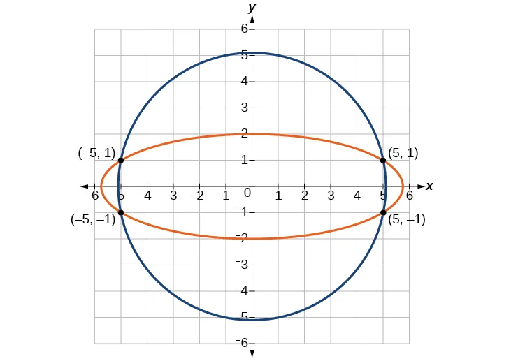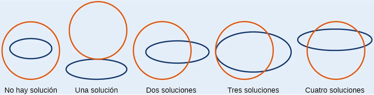 Hemos visto que la sustitución suele ser el método preferido cuando un sistema de ecuaciones incluye una ecuación lineal y una ecuación no lineal. Sin embargo, cuando las dos ecuaciones del sistema tienen variables semejantes de segundo grado, resolverlas mediante la eliminación por adición es más fácil que la sustitución. En general, la eliminación es un método mucho más sencillo cuando el sistema implica solo dos ecuaciones en dos variables (un sistema de dos por dos), en lugar de un sistema de tres por tres, ya que hay menos pasos. A modo de ejemplo, investigaremos los posibles tipos de soluciones al resolver un sistema de ecuaciones que representa un círculo y una elipse.