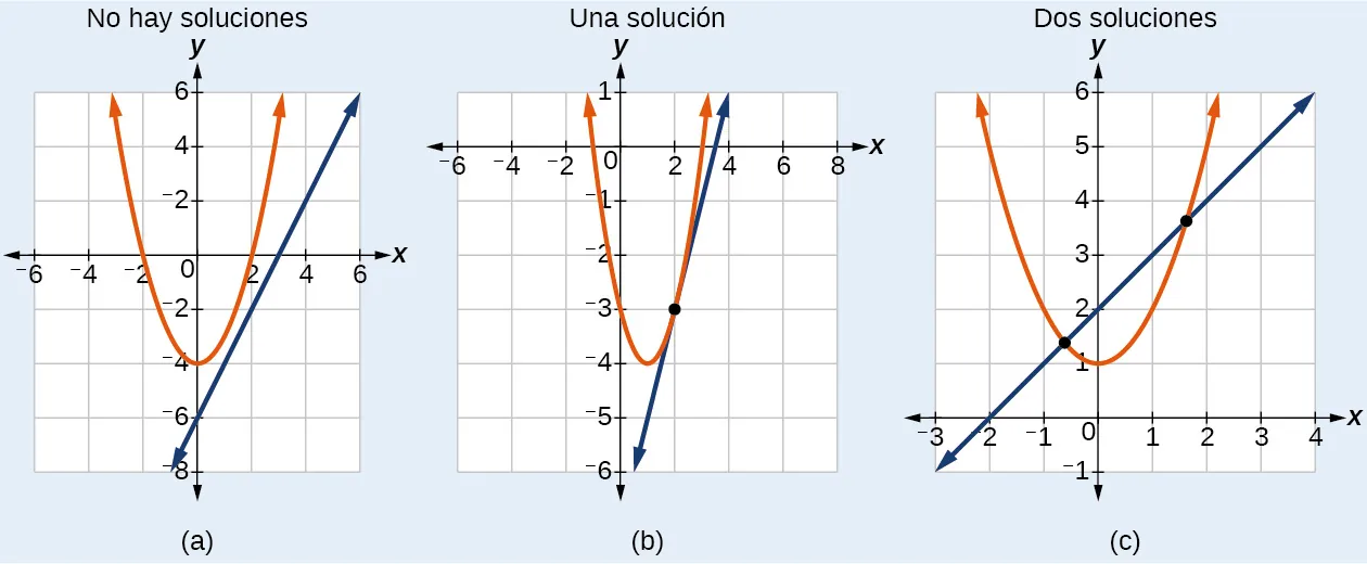 Hay tres posibles tipos de soluciones para un sistema de ecuaciones no lineales que involucran una parábola y una línea.
