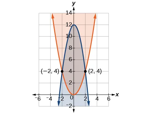 Estas dos ecuaciones son claramente parábolas. Podemos hallar los puntos de intersección mediante el proceso de eliminación: Sume ambas ecuaciones y la variable será eliminada. Entonces, resolvemos para