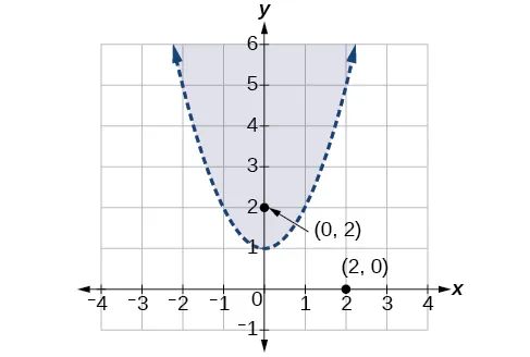 Primero, grafique la ecuación correspondiente Dado que tiene un símbolo mayor que, dibujamos el gráfico con una línea discontinua. A continuación, elegimos puntos para probar tanto dentro como fuera de la parábola. Probemos los puntos y Un punto está claramente dentro de la parábola y el otro punto está claramente fuera.
