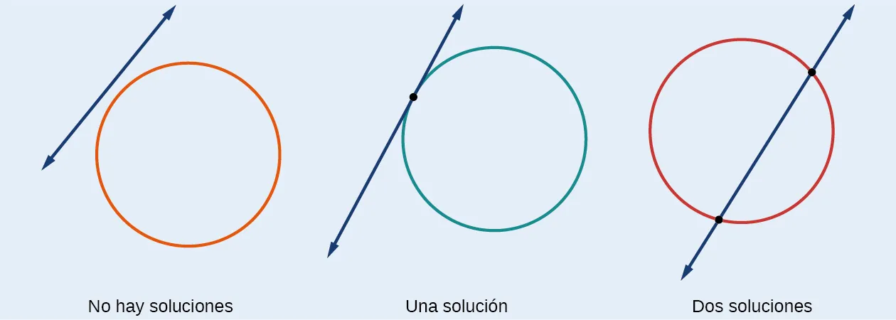 Al igual que con una parábola y una línea, hay tres resultados posibles al resolver un sistema de ecuaciones que representa un círculo y una línea.