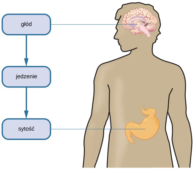 Zgodnie z teorią popędu (ang. drive theory) odchylenia od homeostazy są motorem powstawania potrzeb fizjologicznych. Potrzeby te skutkują stanami popędu psychologicznego, który kieruje zachowaniem tak, by zaspokoić potrzeby i – ostatecznie – przywrócić homeostazę. Znasz to uczucie. Jeśli minęło już kilka godzin od śniadania, czujesz, że kurczy ci się żołądek, organizm wykrywa zmianę poziomu glukozy, aminokwasów i wolnych kwasów tłuszczowych we krwi i zaczyna być wytwarzany hormon grelina. Hormon ten wywołuje fizjologiczną potrzebę i odpowiadający jej stan popędu - głód. Pcha on cię do poszukiwania jedzenia i jego konsumpcji. Tuż po spożyciu posiłku żołądek jest pełny, poziom greliny, glukozy i innych składników krwi wysyła organizmowi sygnał „jestem najedzony” (więcej w Ramce Mechanizm zaspokajania głodu).