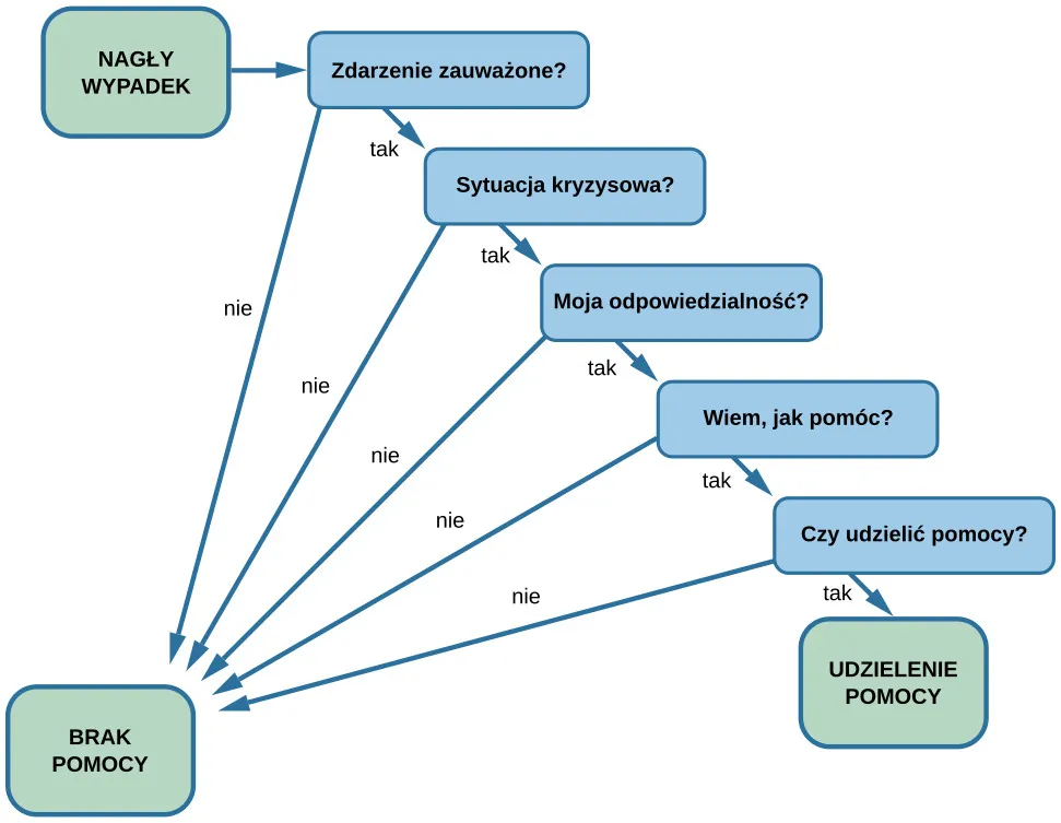 Jedną z teorii wyjaśniających proces podejmowania decyzji o pomaganiu jest decyzyjny model interwencji w sytuacji kryzysowej (ang. decision model of crisis intervention) zaproponowany przez Bibba Latanégo i Johna Darley'a (1970). Model, który omówimy w dalszej części podrozdziału (Ilustracja 12.28), został zainspirowany próbą wyjaśnienia głośnej w latach 60. XX wieku napaści w dzielnicy Queens w Nowym Jorku. Człowiek z nożem zaatakował 19-letnią Kitty Genovese niedaleko tylnego wejścia do kamienicy, w której mieszkała, i jeszcze raz w holu. Gdy doszło do ataku, dziewczyna wołała kilkakrotnie o pomoc. Niestety nikt pomocy jej nie udzielił i ostatecznie zmarła od ran kłutych. Ta historia stała się słynna, gdy okazało się, że kilkoro mieszkańców kamienicy słyszało krzyki o pomoc, ale nie zrobili nic – ani nie pomogli kobiecie, ani nie zadzwonili na policję.
