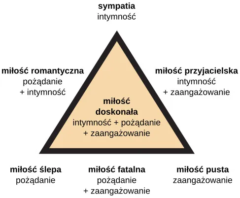 Zazwyczaj kochamy osoby, z którymi tworzymy relacje, ale rodzaje miłości, jakie żywimy do rodziny, przyjaciół i kochanków, różnią się. Robert Sternberg (1986) opracował model miłości oparty na trzech składowych: intymności, pożądaniu i zaangażowaniu; w zależności od obecności lub braku którejś z tych składowych można wyróżnić siedem rodzajów miłości. Ta teoria nazywa się teorią miłosnego trójkąta (ang. triangular love theory) (Ilustracja 12.30). Intymność polega na dzieleniu się szczegółami i intymnymi przemyśleniami oraz emocjami z drugą osobą. Pożądanie wiąże się z przyciąganiem fizycznym – to płomień, który podsyca ogień. Zaangażowanie to trwanie przy drugiej osobie, to właśnie to „na dobre i na złe”, które małżonkowie przysięgają sobie podczas ślubu.