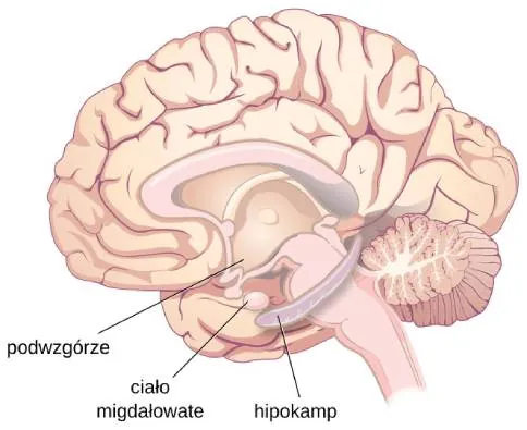 Układ limbiczny (ang. limbic system) bierze udział w przetwarzaniu emocji i śladów pamięciowych. Co ciekawe, szlak węchowy biegnie bezpośrednio do układu limbicznego, więc nie dziwi fakt, że zapachy wywołują reakcje emocjonalne w takim stopniu, w jakim nie może wywołać ich żaden inny bodziec. Układ limbiczny składa się z szeregu struktur; trzy najważniejsze to hipokamp (łac. hippocampus), ciało migdałowate (łac. amygdala) i podwzgórze (łac. hypothalamus) (Ilustracja 3.23). Hipokamp, parzysty narząd, jest niezbędny w procesie uczenia się i zapamiętywania. Ciało migdałowate jest kluczowe w doświadczaniu emocji i nadawaniu wspomnieniom emocjonalnego znaczenia. Podwzgórze reguluje wiele procesów z zakresu homeostazy, w tym temperaturę ciała, apetyt i ciśnienie krwi. Jest także stacją przekaźnikową między układem nerwowym a wewnątrzwydzielniczym oraz nadzoruje popęd seksualny i zachowania reprodukcyjne.