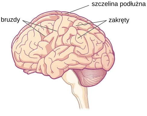 Najbardziej zewnętrzna warstwa mózgu, czyli kora mózgowa (in. kora mózgu) (ang. cerebral cortex), jest nierówna; tworzy ją sieć fałdów znanych jako zakręty (łac. gyrus) oraz doliny, czyli bruzdy (łac. sulcus), co pokazano na Ilustracji 3.15. Te zakręty i bruzdy wyznaczają obszary, dzięki którym możemy podzielić mózg na ośrodki czynnościowe. Najgłębsza bruzda, szczelina podłużna (ang. longitudinal fissure), dzieli go na dwie półkule (ang. hemisphere): prawą i lewą.