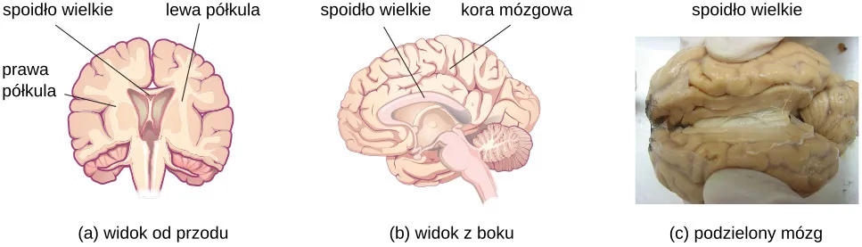 Obie półkule łączy gruba wiązka włókien nerwowych określanych jako spoidło wielkie (łac. corpus callosum) (inaczej: ciało modzelowate), złożone z około 200 mln aksonów. Spoidło wielkie pozwala przekazywać informacje przetwarzane w jednej półkuli do drugiej półkuli.