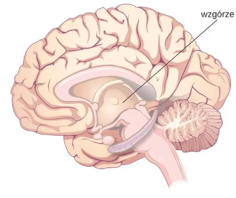 Inne obszary przodomózgowia to położone pod korą wzgórze i układ limbiczny. Wzgórze (łac. thalamus) to stacja przekaźnikowa mózgu. Wszystkie szlaki zmysłowe, z wyjątkiem węchowego, przechodzą przez wzgórze, zanim dotrą do innych obszarów mózgu, gdzie odbywa się ich przetwarzanie (Ilustracja 3.22).