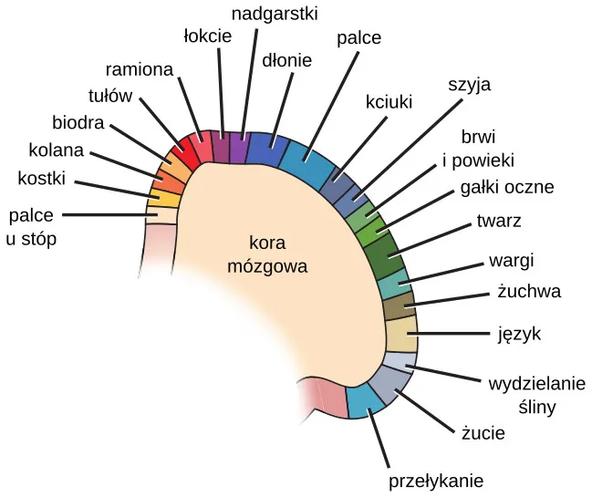 Bezpośrednio za płatem czołowym znajduje się płat ciemieniowy (ang. parietal lobe), zaangażowany w przetwarzanie informacji zmysłowych. Tworzy go kora somatosensoryczna (ang. somatosensory cortex), nieodzowny element przetwarzania informacji czuciowych z całego organizmu, takich jak dotyk, temperatura i ból. Kora somatosensoryczna jest zorganizowana somatotopowo, to znaczy, że na jej powierzchni odzwierciedlone są relacje przestrzenne między obszarami ciała (Ilustracja 3.20). Na przykład obszar przetwarzający informacje czuciowe z dłoni leży w sąsiedztwie obszaru przetwarzającego informacje czuciowe z nadgarstka.